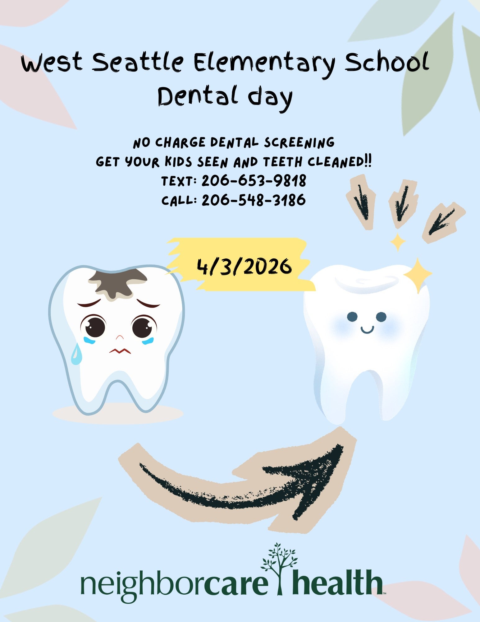Dental Day Posted on: March 3, 2026 We will have dental day on 4/3/2026. No charge dental screening Get your kids seen and teeth cleaned!! Text: 206-653-9818 Call: 206-548-3186