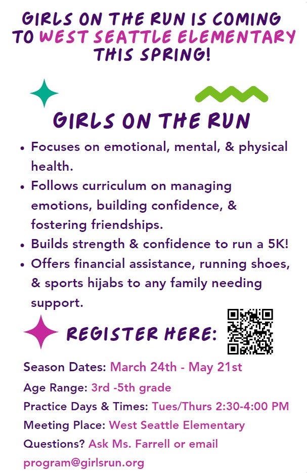 Please reach out to Ms Farrell or Girls on the Run info@girlsrun.org, cpfarrell@seattleschools.org
